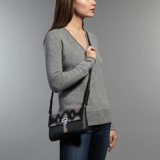 Black calf with black / grey python flap with cobalt accents, black onyx detail and removable, adjustable strap.