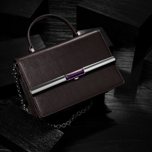 Mahogany embossed calf with amethyst detail and removable chain.